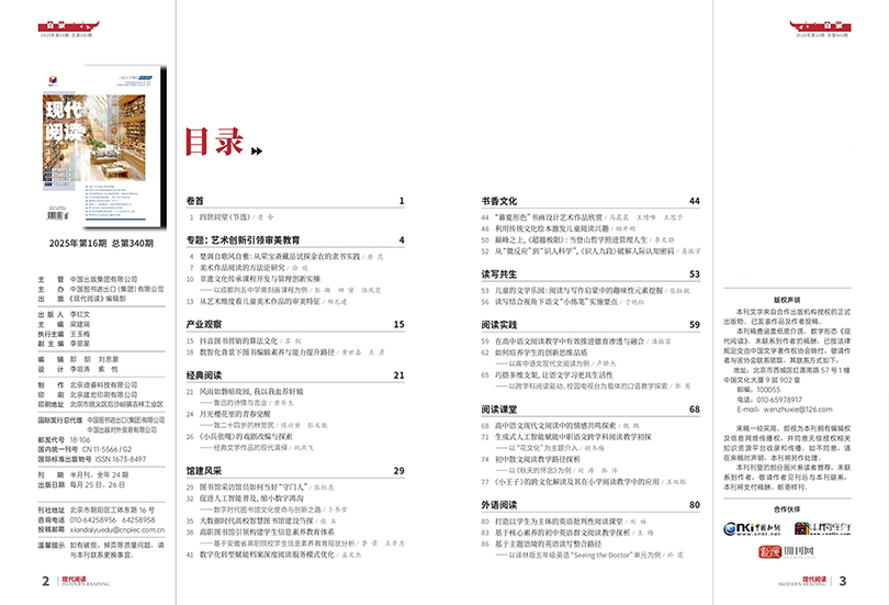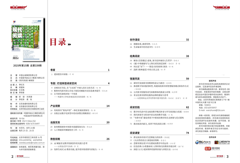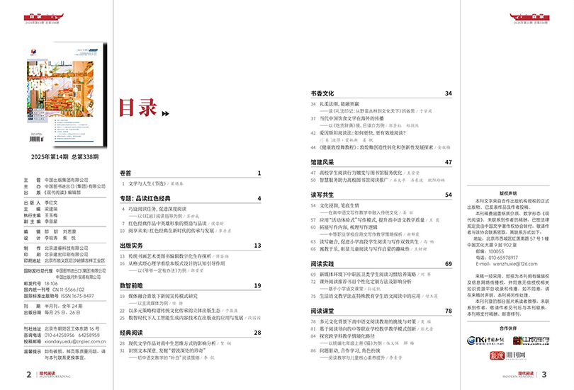 《现代阅读》杂志是一本致力于推广现代阅读文化、提升读者阅读体验的综合性文化期刊。自创刊以来,杂志始终站在时代前沿,关注阅读领域的新动态、新趋势,为读者提供丰富多彩的阅读资源和深入独到的文化解读。